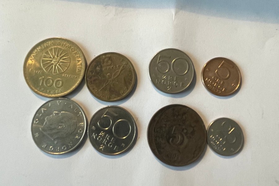 Denna samling innehåller åtta olika valutor. En av valutorna är från Grekland, 100 enheter från 1973. Fyra av valutorna är från Norge: 50 öre från 1973, 5 öre från 1977, 50 öre från 1972 och 5 öre från 1973. De övriga tre valutorna har ingen tydlig ursprungsland eller årtal.