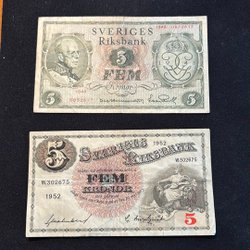 Två svenska sedlar. Den ena är från 1979 med serienummer A 875712 och den andra är från 1981 med serienummer A 550518. Båda sedlarna har ett värde av 5 kronor.