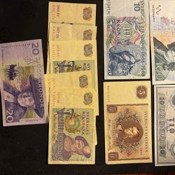 Fem 5-kronorssedlar från 1966 med serienummer C 456116, E 715214. Två 5-kronorssedlar från 1956 med serienummer MG 493336 och från 1963 med serienummer AA 116699. Tre 10-kronorssedlar från 1975 med serienummer B 484203. En 10-kronorssedel från 1957 med serienummer 1879481.