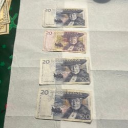 . En 10-kronorssedel från 1939, serienummer I.298307. Två 5-kronorssedlar från 1965, serienummer B.115306 och 1966, serienummer E.712294.