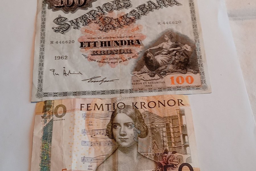 Denna annons inkluderar två svenska sedlar. En 100-kronorssedel från 1962 med serienummer R 446620 och en 50-kronorssedel med serienummer 4211049308.
