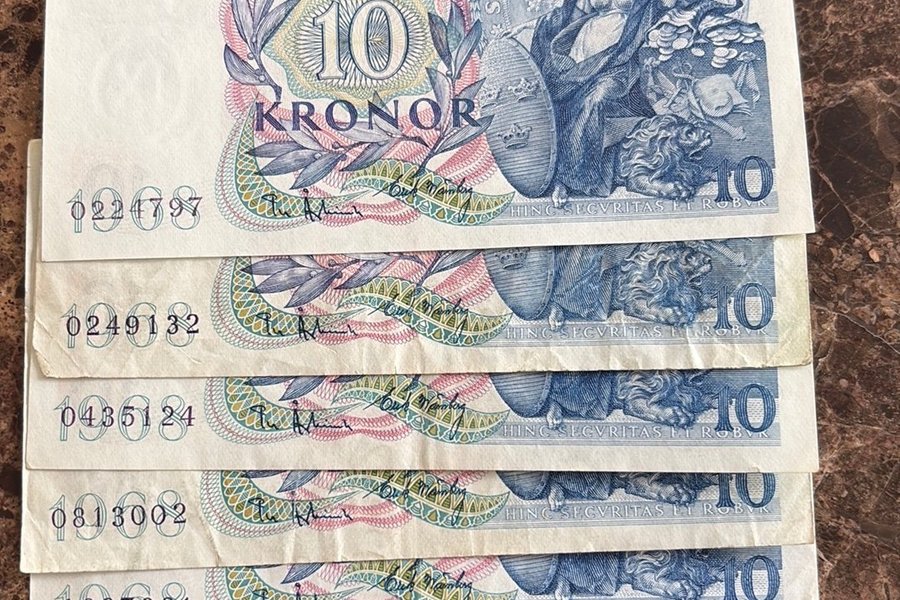 Fem sedlar från Sveriges Riksbank, utgivna 1968. Varje sedel har ett värde av 10 Kronor. Serienummer: 0224797, 0249132, 0435124, 0813002, 1607881.
