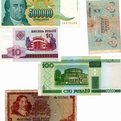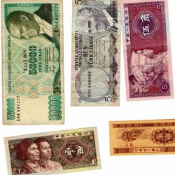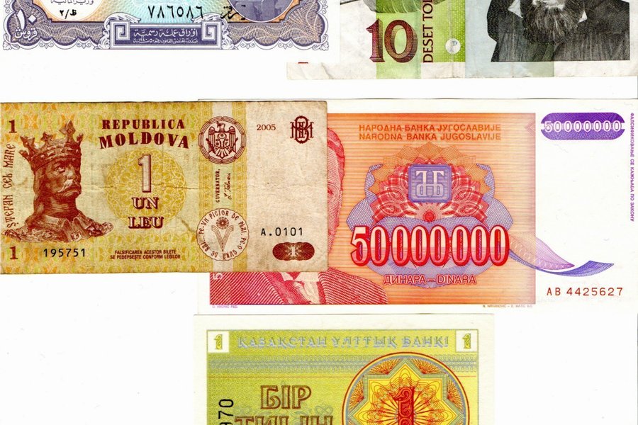 En samling av sedlar från olika länder. Inkluderar en sedel från Egypten med värdet 10 Qirsh och serienummer ??????. En sedel från Moldavien med värdet 1 Leu och serienummer 195751. Jugoslavien sedel med värdet 50000000 Dinara och serienummer AB 4425627. Kazakstan sedel från 1993 med värdet 1 Tiyn och serienummer 8330970.