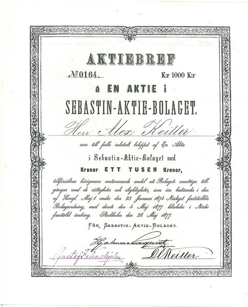 Sebastin, AB, 1.000 kr, 1877, Stockholm, dek. Utställd på Herr Alex Keiller,