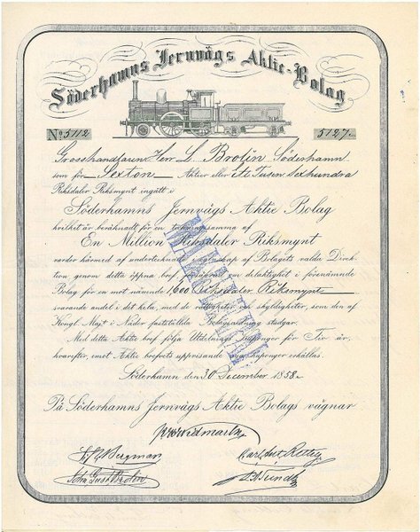 Söderhamns Jernvägs AB, 1 000 Rdr, 1858, Söderhamn, Referens: GA.4658, bild, mak.