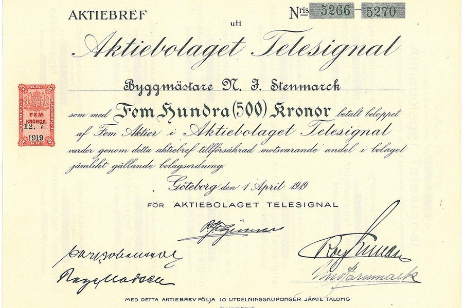 Telesignal, AB, 500 kr, 1919, Göteborg, med kuponger, storlek 27x19,5,