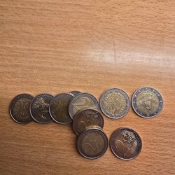 Samling av Euro. Inkluderar 2 Euro från Tyskland (2020), Italien (2002), Kroatien (2023) och Tyskland (2020).