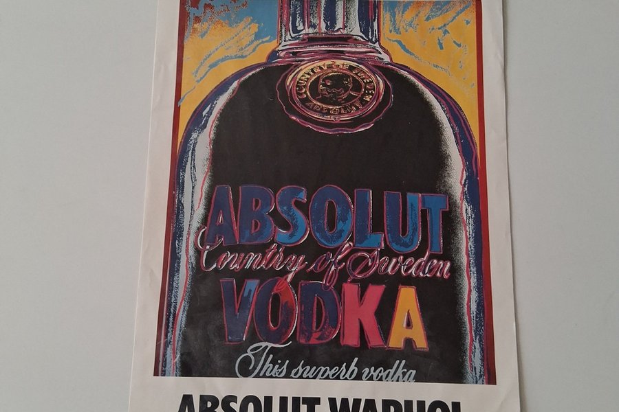 Affisch med Absolut Vodka-flaska i popkonststil. Texten "ABSOLUT WARHOL" finns nedtill på affischen.