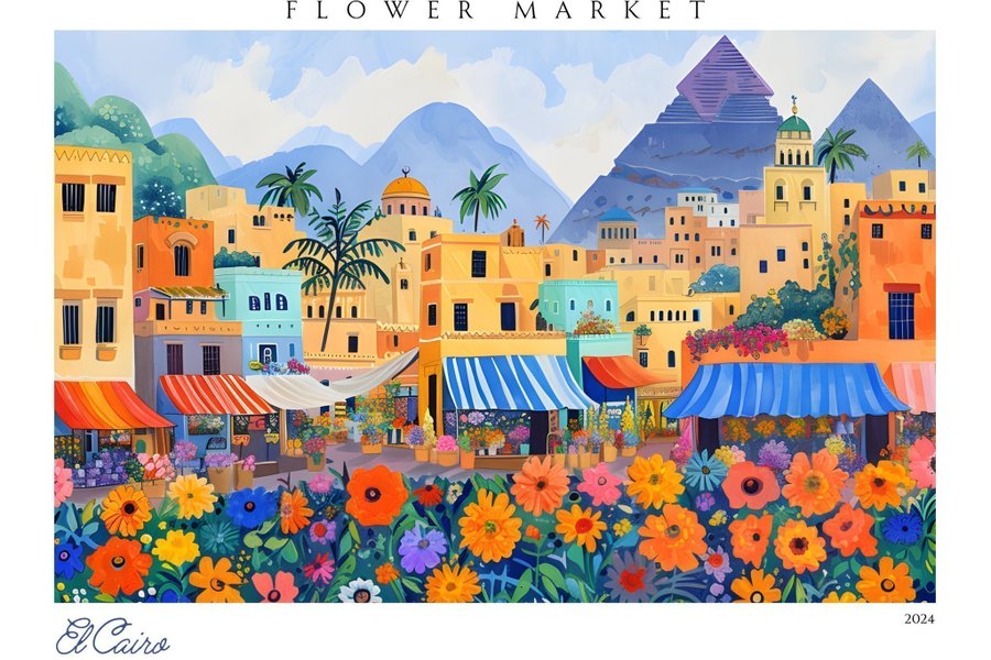 En färgglad affisch som föreställer en blomstermarknad i en stad med pyramider i bakgrunden. Konstverket är signerat 'El Cairo' och daterat 2024.
