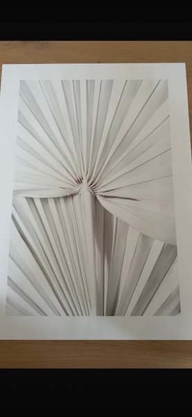 Ett konsttryck med ett abstrakt motiv. Bilden visar veckade tyger som sprider sig utåt från en central punkt, vilket skapar ett mönster av ljus och skugga. Färgerna är i gråskala, vilket ger en minimalistisk känsla.