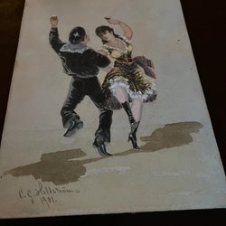 En abstrakt målning med blå bakgrund och ett motiv i rosa och svart. Konstverket är målat på papper. 53x46