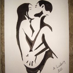 En akvarellmålning på papper. Motivet är två män som omfamnar varandra. Målningen är utförd i bruna och grå toner.