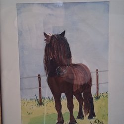 En vacker akvarellmålning som föreställer ett marint motiv. Den har en stuga, en brygga och en hund på en sten.