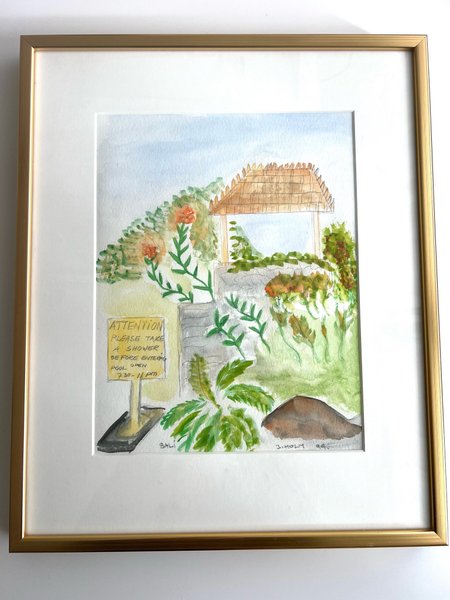 Akvarellmålning med motiv från Bali. Målningen är signerad "J. Holm -94" och föreställer en scen med frodig grönska, en byggnad med halmtak och en skylt med texten "ATTENTION PLEASE TAKE A SHOWER BEFORE ENTERING POOL OPEN 7:30 - 11 PM".