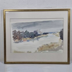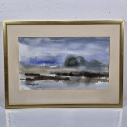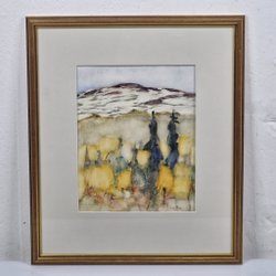 Tavla av akvarellmålning föreställande irisblommor i lila och gult. Signerad av konstnären. En tjusig brun ram i storlek 30x40 cm