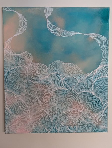 En vacker målning som kan ge en touch av elegans till ditt hem. Den har ett abstrakt mönster i blått, rosa och vitt. Målar i akryl och poscapenna. 37x45,5 cm