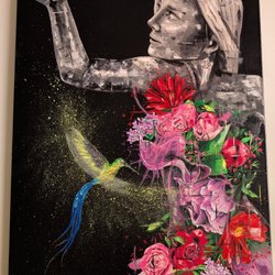 Målning med motiv av blommor och växter. Färgerna är levande och detaljerna är noggrant utförda. Denna målning passar bra i olika rum och inredningsstilar.