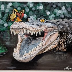 En vacker målning med motiv av en kvinna, blommor och en kolibri. Målad på duk. Mått: 50 x 80 cm.