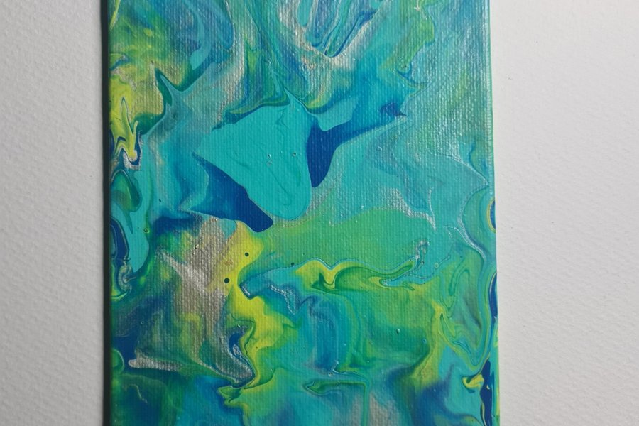 Abstrakt målning i blåa, turkosa och gröna toner. Signerad med initialer i nedre hörnet. Storlek: 10,5x15cm