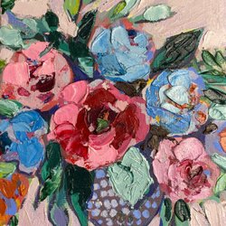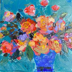 Vacker och unik målning i akryl på canvas, skapad i ett färgstarkt och harmoniskt uttryck. Motivet föreställer en livfull bukett blommor i en klassisk vas, målad i nyanser av lila, rosa, gult och rött. Ett tidlöst motiv som passar perfekt i både moderna och klassiska hem.