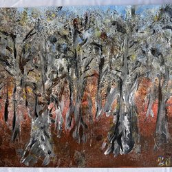 En vacker målning som föreställer ett marint motiv med båtar och landskap. Färgerna skapar en levande och intressant effekt.