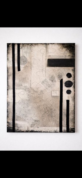 Abstrakt konstverk . Målningen har vertikala svarta linjer och former på en ljus bakgrund. Textur och detaljer finns över hela ytan.