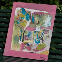 Originalt signerad oljemålning på duk, The Cabaret Rest (2025). Duken mäter 30 × 30 cm plus ram. Verket är vackert inramat och förenar kraftfulla penseldrag med dämpade, stämningsfulla toner. Ett slående modernistiskt stycke som fångar en teatralisk scen av sammanflätade gestalter och skuggfigurer, där abstraktion möter atmosfär.