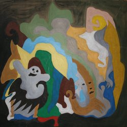 Färgstark abstrakt målning med geometriska former i olika färger.