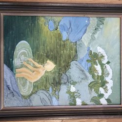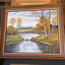 En vacker målning som föreställer ett landskap med träd, vatten och berg i bakgrunden. Målningen har en fin färgpalett som skapar en lugn och harmonisk känsla.