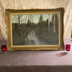 En vacker oljemålning som föreställer ett landskap med en stuga vid vattnet. Konstverket är rikt på detaljer och har en fin färgpalett.