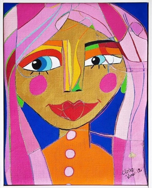 Färgstark målning med ett abstrakt porträtt.