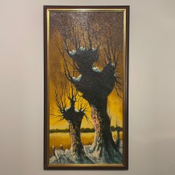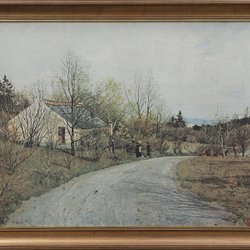En vacker tavla med motiv av ett hus och träd. Signerad av konstnären. Mått: 67 cm x 57 cm.