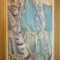 En målning med ett landskapsmotiv. Den visar en sjö med ett berg i bakgrunden och träd på stranden. En båt ligger vid strandkanten.