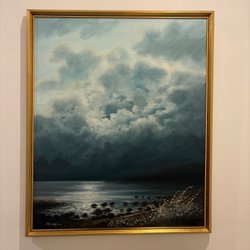 En vacker målning med motiv av båtar och hus vid vattnet. Signerad av konstnären.