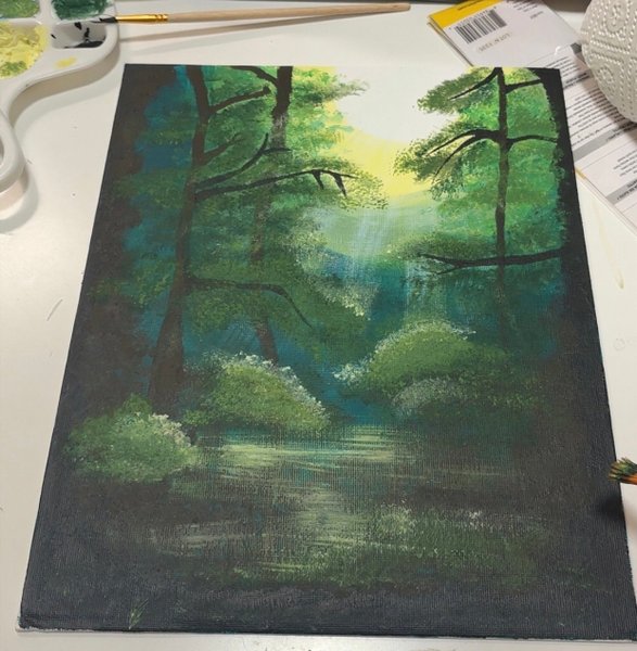 En målning som föreställer en skogsdunge med ljus som skiner igenom trädtopparna. Målningen har en återspegling av skogen i förgrunden.