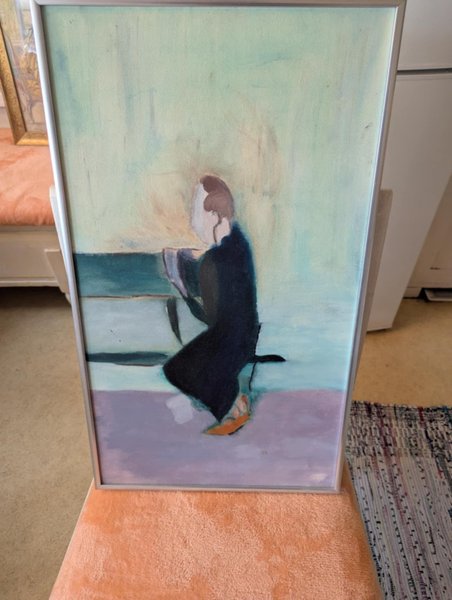 Målning föreställande en sittande figur i mörka kläder med orangefärgade skor. Bakgrunden är i ljusa nyanser av grönt och blått, med en lila mark.