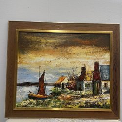 En vacker tavla med motiv av hus vid vattnet. Signerad
