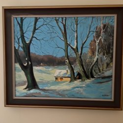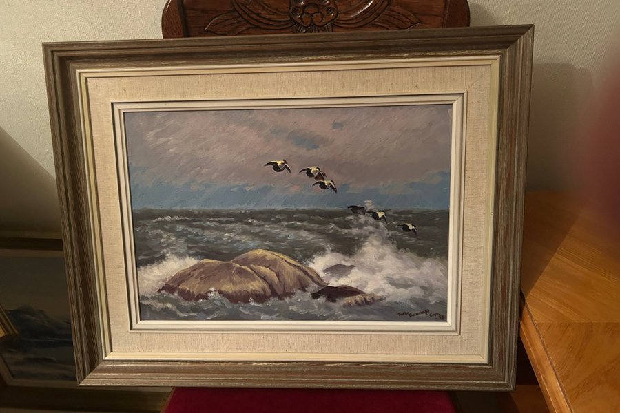 Målning av hav med fåglar. Bredd 60 cm höjd 45 cm. Signerad Folke Gunnar 1958. Konstnär verksam i Bergslagen (Värmland, väster Dalarna , Örebro län)