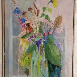 Färgglad tavla med abstrakt motiv. Tavlan har en blandning av varma och kalla färger, med inslag av gult, orange, rött, blått, lila och grönt. Motivet består av organiska former och linjer som flätas samman.