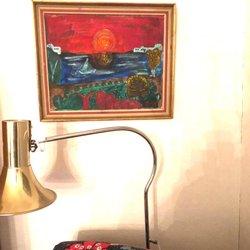 En kritteckning med ett rött hus samt olika växter, i bakgrunden, himmel eller klippor eller båda. Köpt någongång 60/70 tal i ramaffären Merkur i Stockholm. Målad under Ing Schiölers St Jörgen period. Storlek ca 16x20 cm.