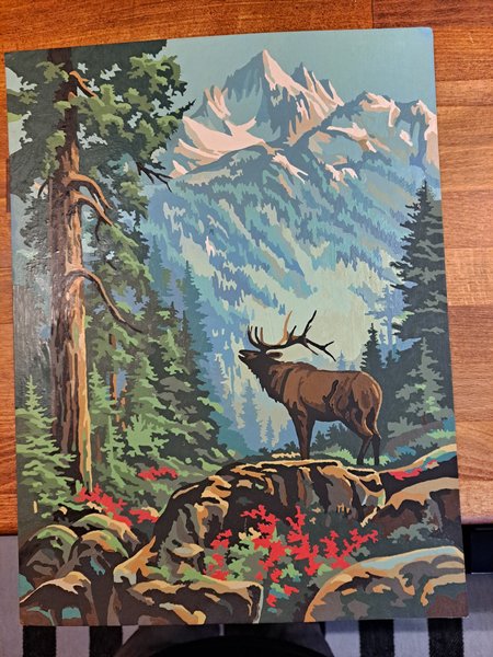 En målning med motiv av en hjort i ett bergslandskap. Utan ram. Handgjord, men vet ej om det är oljefärg eller vad det är.