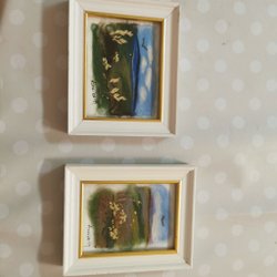 Två tavlor med motiv. Den ena föreställer en skog och den andra en byggnad med en bro.