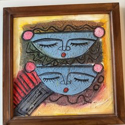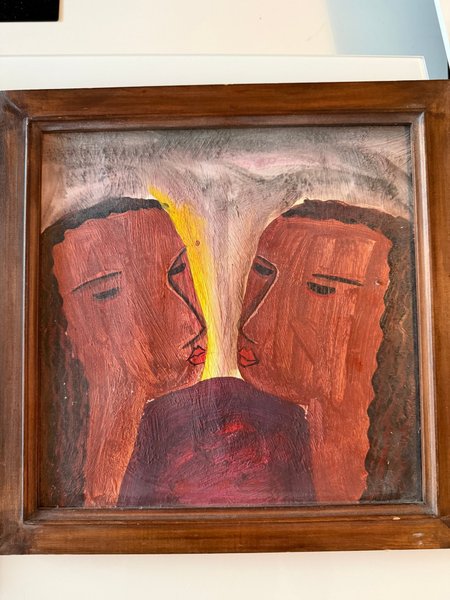 Målning med två ansikten som möts. Färgerna är i nyanser av brunt, rött och gult.