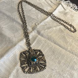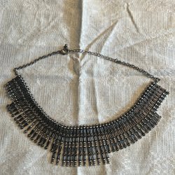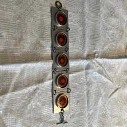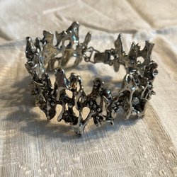 Säljer ett grått metallarmband med kluster av pärlor, liknande en modell av "dangling beads". Troligen tenn.