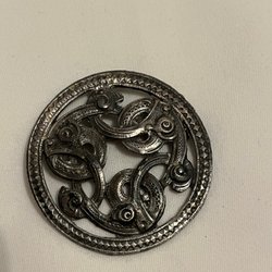 Brosch i tenn märkt L9 H/T ca 6x2 cm Använt skick
