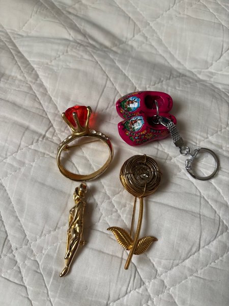 3 broscher i okänt material samt ett par små träskor som nyckelring.