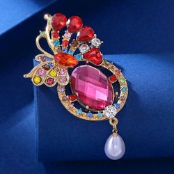 Färgglad brosch i form av en papegoja med en stor blå sten och strassdetaljer. Papegojan sitter på en gren och håller en vit pärla.