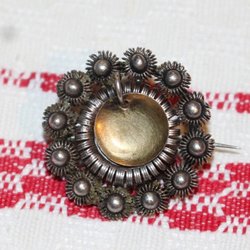 ÄLDRE BROSCH 830 SILVER. MÅTT. 5X4 CM. YTSLITAGE PÅ MEDALJONGEN. NÅGOT OJÄMN RAM RUNTOM MEDALJONGEN.