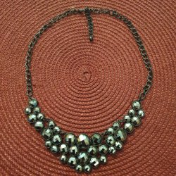 Ett vackert halsband med flera rader av turkosa pärlor och detaljer i guld. Halsbandet har olika typer av pärlor och stenar i olika storlekar och former, vilket ger det en unik och iögonfallande design.