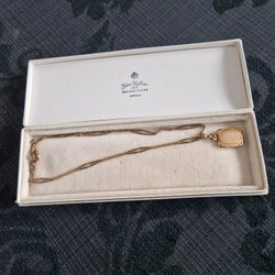 Färgen är guldig och lilafärgad nyans på amulleten.kjedjan är silverfärgad i okänt material.